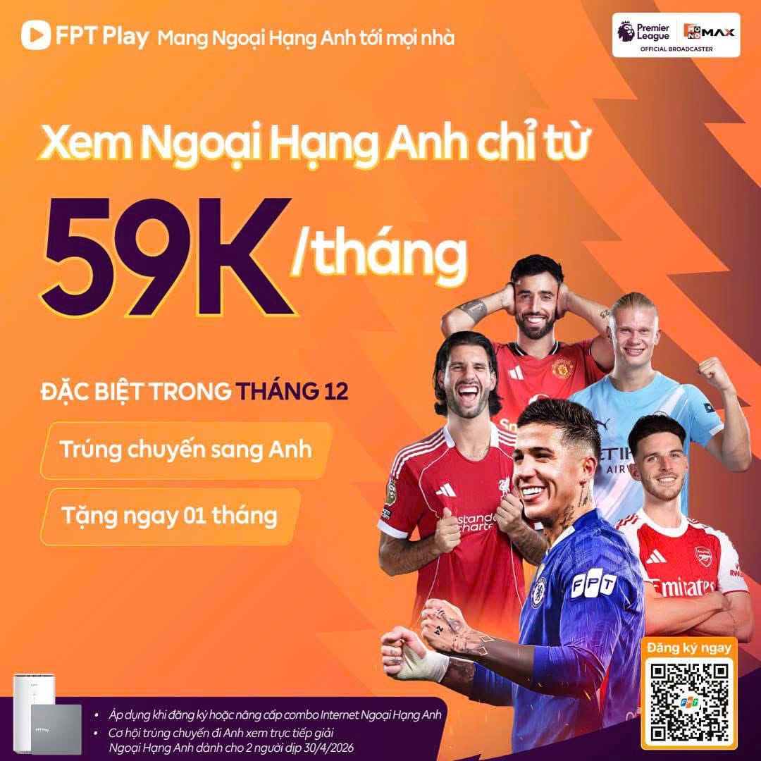 Từ tháng 01/2026, FPT Play chính thức phát sóng Ngoại Hạng Anh bản quyền tại Việt Nam. Người xem được trải nghiệm trọn vẹn các trận cầu đỉnh cao, cảm xúc bùng nổ trên một nền tảng duy nhất.